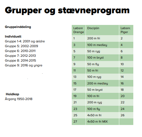 Skriv gerne hvilke løb der ønskes - det er mulighed for 4 discipliner. Der tages forbehold for, at trænerne kan ændre på de ønskede løb, hvis de vurdere at dette er for svømmerens bedste.